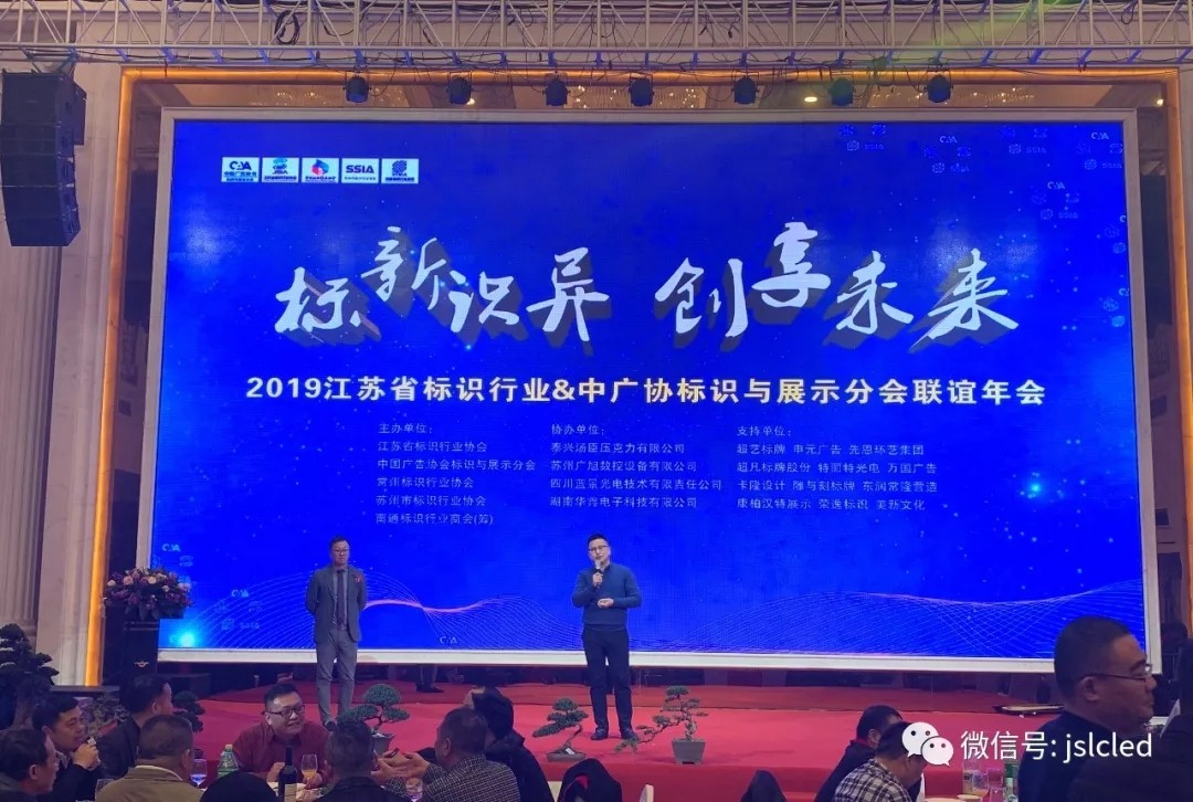 2019年11月28日,感恩節的當天,在南通普天同慶大酒店隆重舉辦了江蘇標識行業&中廣標識與展示分會聯誼年會。由江蘇省標識行業協會、中國廣告協會標識與廣告分會、蘇州市標識行業協會、常州標識行業協會、南通市標識行業協會(籌)聯合主辦,是整個江蘇省標識人的盛會。