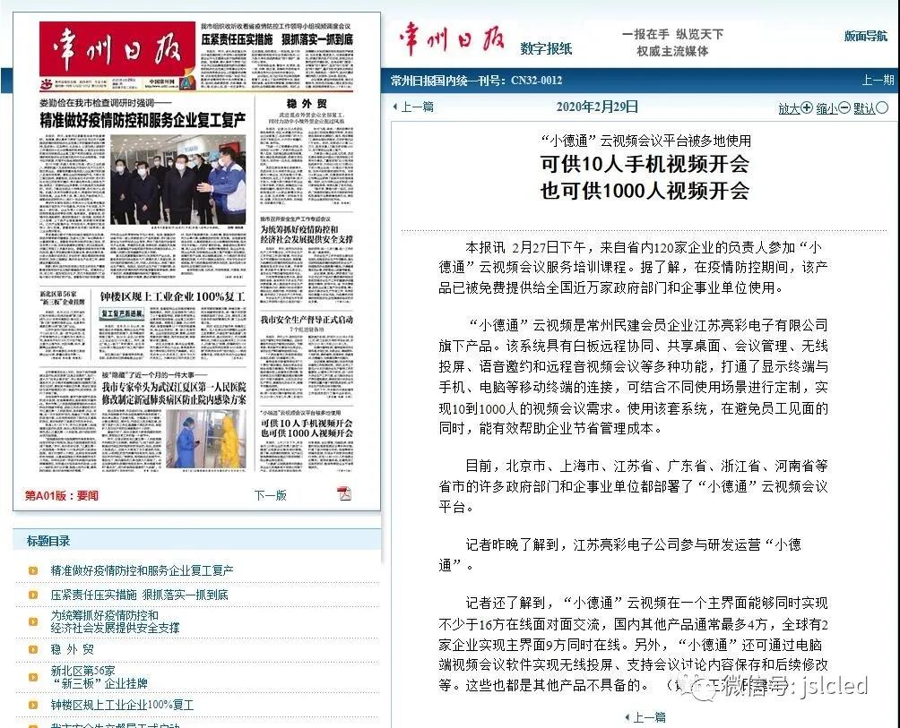 隨后進(jìn)行了座談會(huì),大家進(jìn)行深度交流。章總對(duì)各位領(lǐng)導(dǎo)到來(lái)表示歡迎,并向領(lǐng)導(dǎo)們介紹了江蘇亮彩和利亞德戰(zhàn)略合作關(guān)系,作為利亞德集團(tuán)江蘇省級(jí)工程商、會(huì)議商顯江蘇總運(yùn)營(yíng)商。公司主營(yíng)的版塊:智能顯示、智慧城市終端、會(huì)議商顯、夜景照明、文化旅游、AR/VR娛樂(lè)、供電系列。2020年2月29日,常州日?qǐng)?bào)頭版報(bào)道了疫情期間,“江蘇亮彩”旗下“小德通”云視頻會(huì)議平臺(tái)被多地免費(fèi)使用,助力企事業(yè)單位線上辦公會(huì)議,同時(shí)也加快了視頻會(huì)議替代傳統(tǒng)現(xiàn)場(chǎng)會(huì)議的腳步。